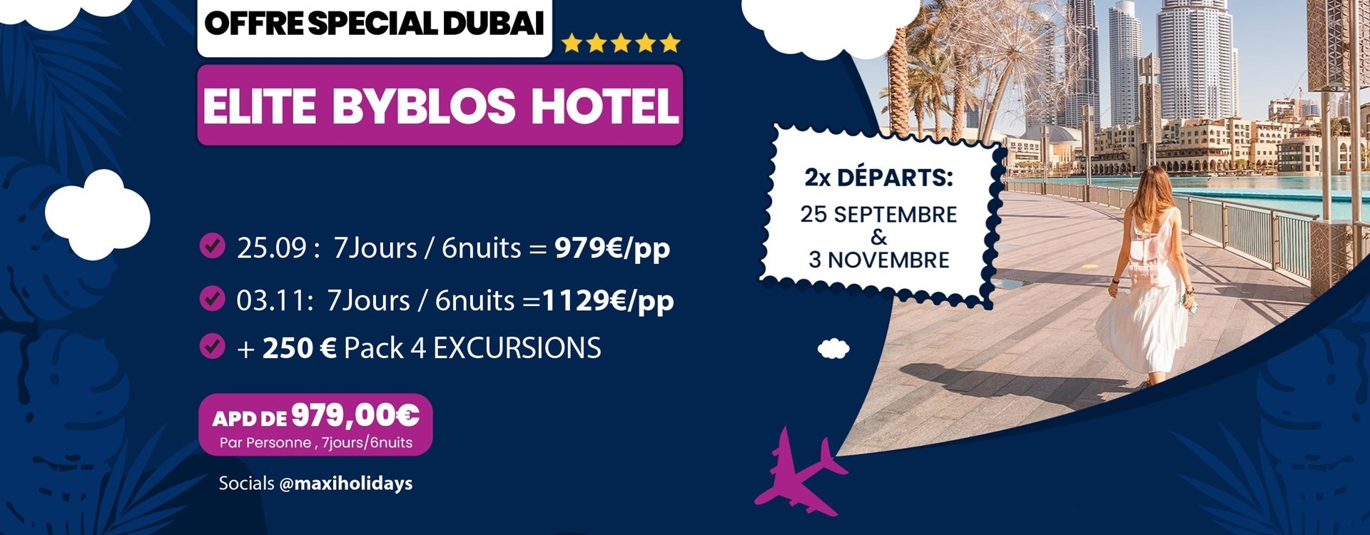 MAXI TOP DESTINATIONS Magic Istanbul AVAILABILITY Unavailable DURATION 4 jours FROM €599,00 L’Egypte au fil du Nil AVAILABILITY Unavailable DURATION 8 jours FROM €1829,00 Elite Byblos Dubai AVAILABILITY Unavailable DURATION 7 jours FROM €1449,00 MAXI DEALS Khayam Garden Beach Resort & Spa AVAILABILITY Unavailable DURATION 7 jours FROM €679,00 L’Egypte au fil du Nil AVAILABILITY Unavailable DURATION 8 jours FROM €1829,00 Séjour spécial sénior AVAILABILITY Unavailable DURATION 21 jours FROM €1099,00 MAXI SEJOURS Magic Istanbul AVAILABILITY Unavailable DURATION 4 jours FROM €599,00 Elite Byblos Dubai AVAILABILITY Unavailable DURATION 7 jours FROM €1449,00 Khayam Garden Beach Resort & Spa AVAILABILITY Unavailable DURATION 28 jours FROM €1269,00