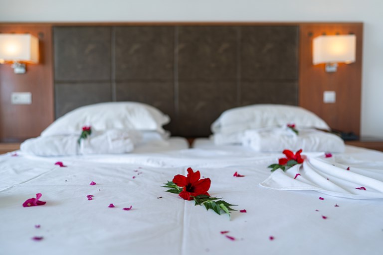 L’hôtel compte un total de 361 chambres (288 chambres doubles, 6 chambres doubles spacieuses, 51 chambres familiales dont 15 communicantes, 11 chambre singles et 5 suites). 60% d’entre elles donnent directement sur la mer, les autres ouvrant sur la piscine ou sur les jardins, et toutes disposent d’un balcon. Réparties en trois blocs de trois étages, elles sont dotées des commodités d’usage : télévision satellite, coffre-fort, téléphone, mini-frigo, air conditionné et chauffage, salle de bains équipée (baignoire ou douche, sèche-cheveux).